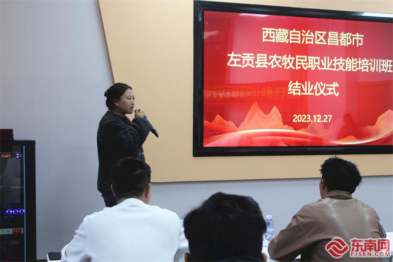 西藏自治区昌都市左贡县农牧民职业技能培训班结业仪式现场,图为学员分享感受。(东南网记者 李霖 摄)