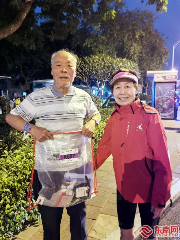 87岁的跑者郑承端(左)和69岁的跑者刘艳荣(右)赛前合影。(东南网记者 刘玮 摄) 清晨6时许,来自全国各地的跑者迎着朝阳汇聚厦门国际会展中心起跑点,不少跑者在乘坐公交车抵达附近站点后,均下车步行前往赛道。今年87岁的跑者郑承端是厦门马拉松赛永久号码的拥有者,连续22年报名参加赛事的他今年依然没有缺席,他表示,坚持跑马拉松给他带来了好的身体和精神状态,让他的老年生活充满了活力。他期望今年能够在5-6小时内跑完全程。“如果身体允许,我会一直跑下去。”郑承端对记者说道。 第一次来厦门参赛的69岁的跑者刘艳荣说:“厦门给我的印象一直是个美丽的城市,这次能来厦门参赛非常高兴,期望能在厦门跑出好的成绩,赛后我还想在厦门多走走、多看看。”