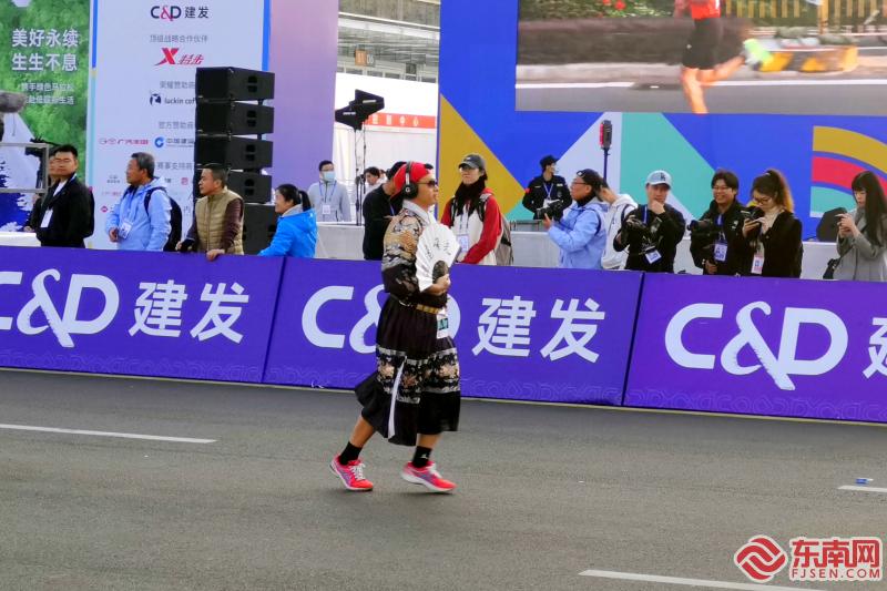 身着民族服饰的女跑者开心奔跑(东南网记者 刘玮 摄)