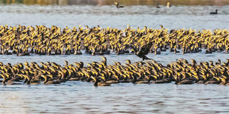 鸬鹚在园博苑水域集结“编队”,蔚为壮观。