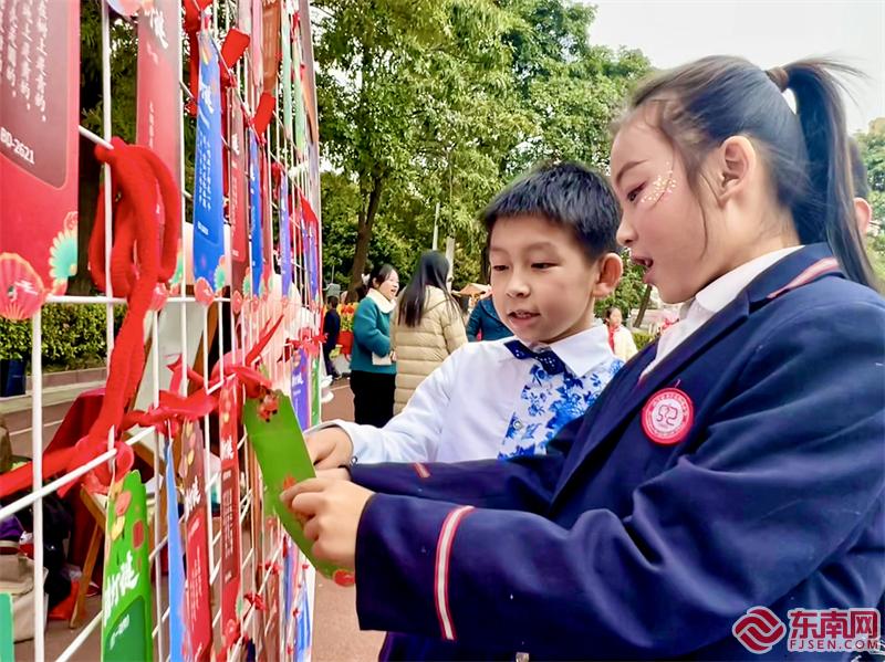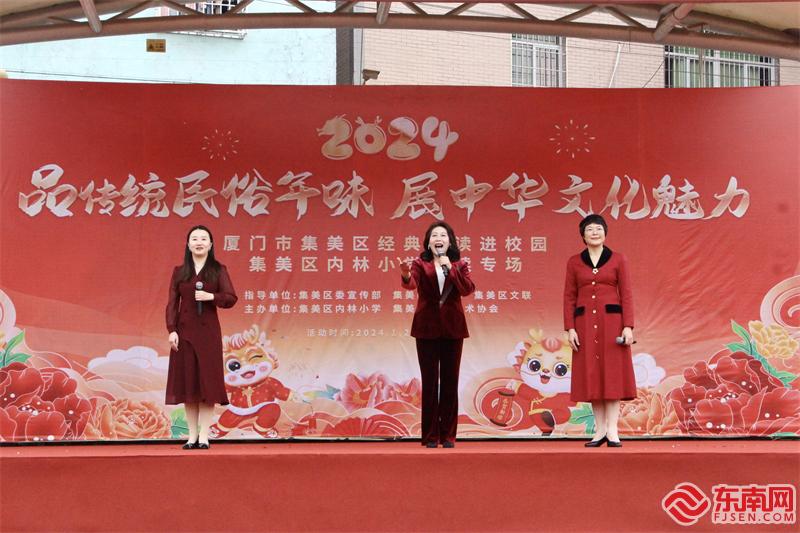 小朋友们身穿盛装迎新春。(东南网记者 李霖 摄) 东南网1月25日讯(记者 李霖)经典诵读、趣味游园、文艺汇演……1月25日下午,厦门市集美区经典诵读进校园——“品传统民俗年味 展中华文化魅力”内林小学诵读专场举办。内林小学师生、家长及朗诵者们齐聚一堂辞旧迎新,在诵读中汲取精神力量,从民俗中吸收文化养分。 “在新的一年里,祝愿我们的祖国好!祝愿祖国更加繁荣昌盛,前进时脚步如滚滚奔腾、不可阻遏的万里大潮……”此次诵读专场分为“峥嵘岁月”“幸福时光”“新年你好”三个篇章。集美区朗诵艺术协会朗诵者们、内林小学师生轮番登场,用多种形式的诵读,重温峥嵘岁月,缅怀革命先烈,回顾集美发展,歌颂青春乐章,共贺新春佳节,共话美好未来。 内林小学校长张亚丽告诉记者,活动将传统文化、经典诵读相结合,让孩子现场通过诵读的方式,亲身体验传统文化的魅力,了解传统文化,喜欢传统文化,自觉成为传统文化的传承者和传播者。 除了经典诵读节目,当天,内林小学的学生们也纷纷登台展现“十八般武艺”,营造了新春佳节的浓厚氛围。与此同时,写春联、剪窗花、扎灯笼、猜灯谜……操场四周,由学生主导,老师、家长、社区助力完成的游园活动,让参与者沉浸式感受春节民俗风情。 此次活动由集美区委宣传部、集美区文联、集美区教育局指导,集美区内林小学、集美区朗诵艺术协会主办。据悉,集美区经典诵读进校园是集美区文艺发展专项资金扶持项目,已经走进集美区多个校园,让红色的种子深植青少年儿童的心田。