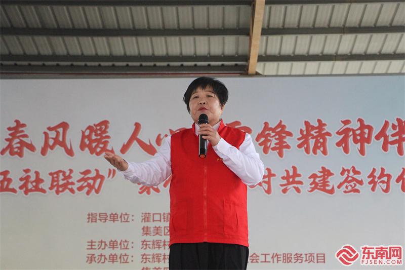 卢妈妈爱心队志愿服务点在东辉村揭牌(黄春梅 摄) 东南网3月5日讯(记者 李霖 陈淼淼 李奇) “我们用大海般辽阔的胸怀,用太阳般炙热的心灵,用爱温暖世界,用奉献谱写青春……”近日,厦门市集美区东辉村徐厝后戏台上,卢妈妈爱心队负责人卢秀毅声情并茂地朗诵诗歌,抒发坚持敬老助残事业的决心,引得在场观众频频点头、掌声不断。 当天,“五社联动”聚合力结对共建签约仪式在这里举办。卢妈妈爱心队与东辉村五社联动项目组签约共建,并揭牌了志愿服务点。这是继田头、黄地、李林之后,卢妈妈爱心队入驻的第四个村居,意味着一系列敬老助残志愿服务活动将在这里常态化开展。 现场,一头干练短发、身着红马甲、肩背小喇叭的“卢妈妈”卢秀毅像陀螺一般忙个不停——落实设备、紧盯流程,还要亲自上阵表演。卢秀毅笑着说,投身志愿服务十余载,也练就了“十八般武艺”。