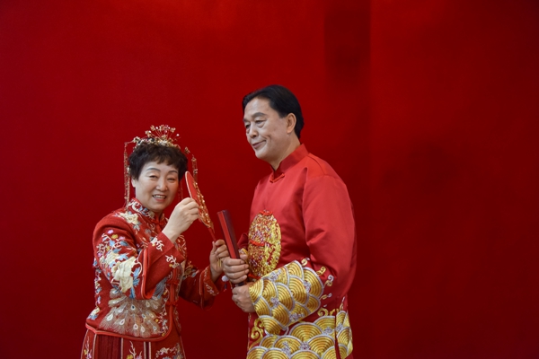 红色喜庆的中式婚礼服照,为老年夫妇留下幸福印记。