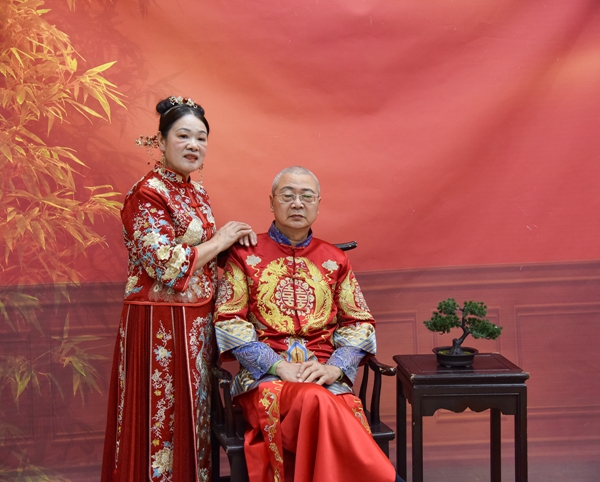工作人员为老年夫妇拍摄中式婚礼服和西式婚纱照。