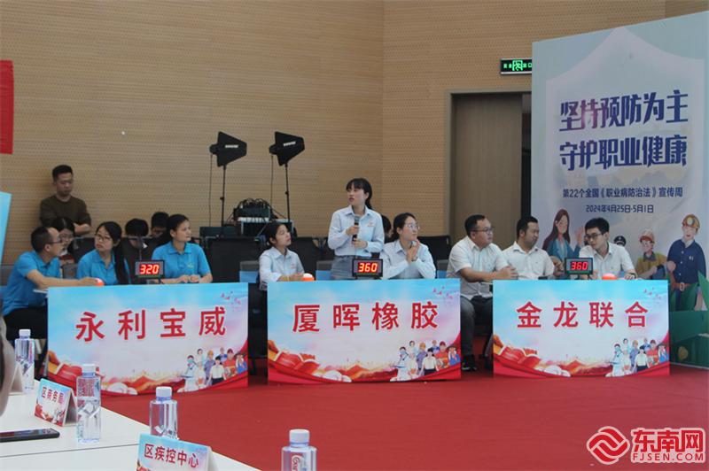 2024年集美区职业健康素养知识竞赛现场(东南网记者 李霖 摄) 东南网4月26日讯(记者 李霖)4月26日上午,“坚持预防为主,守护职业健康”2024年集美区职业健康素养知识竞赛在厦门举办,辖区12支企业代表队参赛,比拼职业健康知识,提升职业健康素养。 此次赛事由集美区卫生健康局、集美区工业和信息化局、集美区总工会主办,集美区疾病预防控制中心承办,旨在宣传普及职业病防治知识,提高用人单位和劳动者的职业健康素养水平,指导企业建立良好的作业方式和环境,维护劳动者职业健康权益。 集美区卫生健康局副局长方琳颖致辞表示,希望参赛企业以赛促学、以学促行,当好“领头羊”,传播科学的职业健康知识,让更多的人了解职业健康的重要性,共同营造全社会人人关注职业健康的氛围。 比赛现场 12支企业代表队激烈比拼 据悉,经过前期报名和初选,最终有12支企业代表队进入竞赛环节。各支队伍的参赛队员由企业主要负责人、职业卫生管理人员和职工组成。比赛分为必答题、抢答题、风险题,内容涵盖职业健康相关法律法规、职业病危害因素及其防护措施、职业健康管理知识等。 “职业病危害因素侵入人体的途径有哪些?”“谁应全面负责本单位的职业病防治工作?”“防治尘肺的根本措施是什么?”比赛现场,各支参赛队伍沉着应战、配合默契,经过多轮比拼、层层考验,最终杏晖光学(厦门)有限公司代表队获得一等奖。 赛事除了全程直播,还设有现场有奖问答和线上抽奖环节,吸引观众积极参与,助推形成人人关注职业健康,人人参与职业健康的良好氛围。 线上线下 营造关注职业健康浓厚氛围 今年4月25日至5月1日是我国第22个《职业病防治法》宣传周。为营造全社会关心关注职业健康的浓厚氛围,集美区疾控中心围绕宣传周主题,拍摄制作了《守护职业健康 共创健康集美》宣传视频,展示了集美区职业病防治工作取得的成效,还走进集美区各行各业,邀请职工倾情演出,共话职业健康,奏响职业健康旋律。 集美区疾控中心相关负责人告诉记者,为进一步宣传《职业病防治法》,普及职业健康知识,倡导健康工作方式,提升职业人群的健康素养水平,推动落实用人单位职业病防治主体责任,4月开始,集美区疾控中心相继开展了3期线上职业健康科普宣传有奖问答活动,通过寓教于乐的方式,普及常见职业病防治知识,有效提高了辖区职工的职业健康知识素养。 据统计,线上有奖问答活动共吸引了集美区共3351人次参与答题。值得一提的是,集美区疾控中心还联动各单位,发动辖区230多家企业广泛参与,扩大活动覆盖面,提升职工参与积极性。