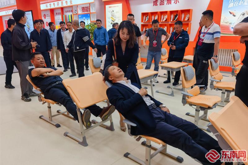 嘉宾们在成品展示区体验新型课桌椅(东南网记者 刘玮 摄) |