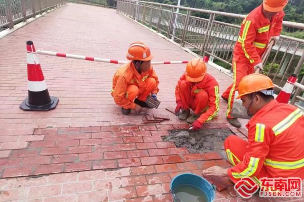 养护工人们在烈日下进行铺砖作业(厦门公路中心供图) 在翔安北路等路段,一线养护工人们蹲在破损的路面娴熟地进行铺砖作业,拉车、和泥、搬砖、铺设……相互配合,有条不紊地进行着一项项工作,衣服已被汗水浸透,豆大的汗珠不停地从脸颊滴落。“因为长时间蹲着铺砖,每次站起来时头都比较晕,尤其是大热天,我每天要喝很多水,还备着防暑用品。”养护工周先生告诉记者。