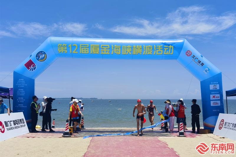 选手在引导船的指引下,在大海中劈波斩浪(东南网记者 刘玮 摄) 东南网7月21日讯(记者 刘玮 李奇)厦金搏浪,青春绽放。7月21日,第12届厦金海峡横渡活动顺利落幕。来自大陆及港澳台地区100队200名选手,逐浪厦金海峡,绽放青春与激情,为两岸交流再添佳话。 活动采用双人接力赛制,从小金门双口村海域出发,途经槟榔屿与烟屿中线附近的接力点后,游至厦金跨海横渡救生指挥中心,全程穿越厦金海峡。上午10时30分,100支队伍的首棒选手齐聚小金门,在鸣笛声和欢呼声中率先跃入海中,开启了速度与耐力的较量。“泳士”们击水搏浪,奋勇向前,在蓝天碧海间酣畅泳动。作为两岸重要体育交流活动,比赛吸引了19个省市、地区的众多游泳爱好者和专业运动员参赛。