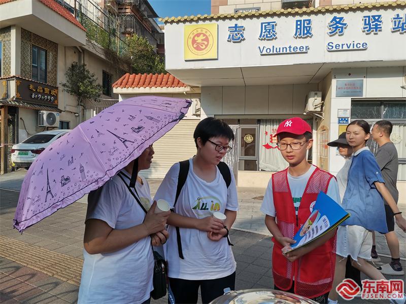 志愿者向往来行人科普防暑降温知识。(集美区银江路志愿服务驿站供图)