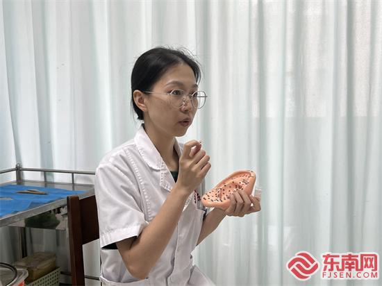 中医科执业医师陈琳霞介绍耳穴压豆(东南网记者 李霖 摄)