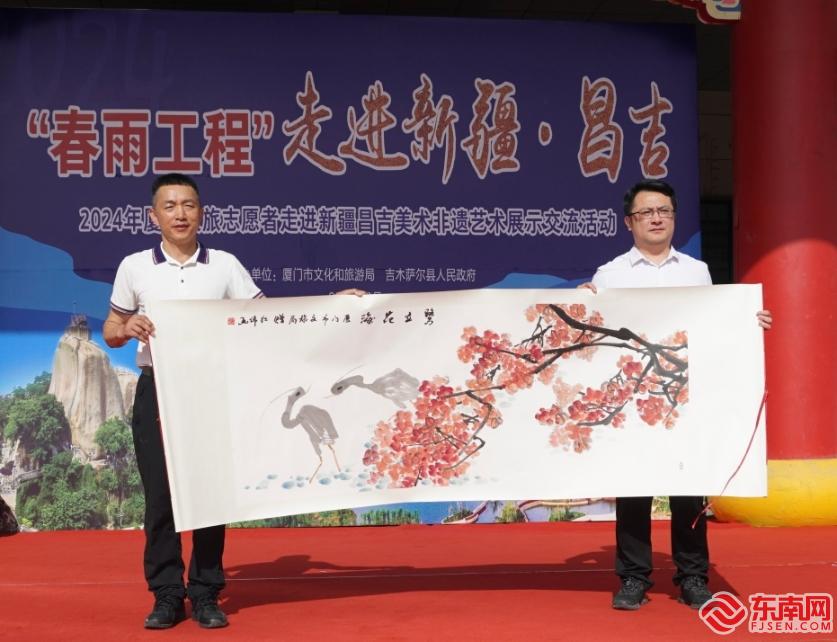 2024年“春雨工程”厦门文旅志愿者走进新疆吉木萨尔。(主办方供图) 东南网8月23日讯(记者 卢超颖)8月19日至23日,“2024年‘春雨工程’——厦门文旅志愿者走进新疆维吾尔自治区昌吉回族自治州吉木萨尔县美术非遗艺术展示活动”在新疆昌吉回族自治州吉木萨尔县举办。 本次活动以“‘援’来是你,‘疆’来可期”为主题,旨在通过输送厦门优质文化资源,助力边疆民族地区文化和旅游的融合与高质量发展,增进各民族文化的广泛交往、全面交流、深度交融。 在吉木萨尔县文博中心举行的开幕式上,厦门市文化和旅游局副局长王国娣发表致辞,强调文化交流在促进民族团结和共同繁荣中的重要作用,并向吉木萨尔县政府赠送了由厦门市美术馆美术家精心创作的六尺国画《鹭立花海》,寓意着两地文化交流的深厚情谊与美好愿景。随着福建援疆厦门分指挥部指挥长、吉木萨尔县委副书记陈志雄宣布活动开幕,一场文化盛宴正式开启。 活动中,厦门与吉木萨尔两地的艺术家和非遗传承人联袂呈现了一场视听盛宴。厦门文旅志愿者带来的高甲戏、闽南杖头木偶表演等国家级非遗项目,与吉木萨尔的蒙古族长调、马头琴独奏及民族舞蹈等节目交相辉映,两地文化的碰撞与交融,不仅为观众带来了美的享受,更让现场观众领略到了闽南文化和草原文化的独特魅力。 同期,由厦门市文旅局、厦门市文化馆策划的厦门摄影艺术展也在文博中心举行。70幅精选摄影作品内容广泛,从厦门的现代化城市建设到旖旎的自然风光,从悠久的历史遗迹到生动的人文景观,每一幅作品都深刻诠释了厦门这座海滨城市的独特韵味,进一步加深了两地民众的了解与友谊。许多观众在观展后更是心生期待:“厦门的美景和人文让人心驰神往,厦门,等着我!” 厦门美术非遗艺术展在吉木萨尔县新地乡小分子画家村举办,不仅汇聚了20幅厦门市美术馆珍藏的馆藏精品,还特别展出了30幅充满乡土气息与民间智慧的农民画作品,充分展现了厦门深厚的艺术积淀与多元文化魅力。翔安区文化馆馆长、翔安农民画市级传承人潘志坚在文博中心带来的农民画专题讲座——《翔安农民画的前世今生》,以独特艺术展现农村风貌,让听众直观感受了农民画的色彩与构图之美。厦门美术非遗艺术展和翔安农民画专题讲座,为两地艺术家和爱好者提供了学习和交流的平台。在文博中心的书画交流笔会上,两地艺术家携手创作,为吉木萨尔艺术界注入了新灵感,激发创作活力,共促文化艺术繁荣。 厦门市文化和旅游局副局长王国娣一行人还走访了福建援疆厦门分指挥部,与厦门市第九批援疆干部就未来文艺交流、文化遗产保护、旅游产业发展等领域的援疆交流合作进行了深入探讨。在这一过程中,厦门方面积极响应“你搭台我唱戏”的号召,致力于将优质文化资源送到基层,让文化之光照亮每一个角落。同时,结合当地特色美食节等活动,进一步丰富民众的文化生活体验,让文化润疆的举措更加接地气、入人心,共同绘就一幅文化繁荣、民族团结的美好画卷。 吉木萨尔与厦门,虽远隔千山万水,但文化的桥梁已将两地紧密相连。此次“春雨工程”活动的举办,不仅加深了厦门与吉木萨尔之间的文化联系,更为两地文化融合发展开辟了新路径。未来,厦门与吉木萨尔将继续携手并进,以文化为纽带,共同谱写文化融合与民族团结和谐发展的新篇章,让天山与大海的故事在更广阔的舞台上绽放光彩。 |