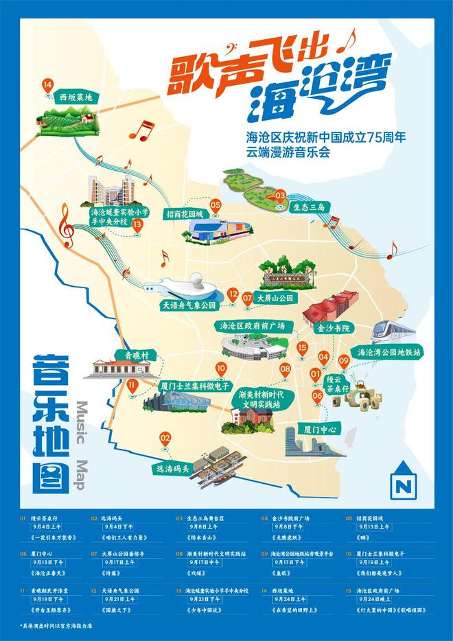 今年是新中国成立75周年 你会如何为祖国庆生呢? 你将如何向祖国表达爱意? 海沧人民决定用独特的庆祝方式 来向祖国告白 “歌声飞出海沧湾” ——海沧区庆祝新中国成立75周年 云端漫游音乐会 七十五载沧海蝶变 七十五载逐梦而兴 海沧从偏居一隅的闽南小渔村 正在蜕变成为高素质高颜值国际一流湾区 海沧人民 在感受美好生活的同时 更为伟大祖国的繁荣富强由衷自豪 他们决定用自己的歌声来为伟大的祖国庆生 为自己的幸福生活发声 本次活动 由中共海沧区委宣传部联合海沧区多部门 共同发起 1、实景展演 本次音乐会精心挑选了海沧区15个实景演出场地,立体展现海沧高素质高颜值的国际一流湾区形象。 2、音乐地图 我们将15个演出地点汇聚成一张“音乐地图”,为大家带来全新体验;你可以拿着地图,开启一场场音乐的探险之旅。 3、表白方式 线下,你能够前往每一处富有意义的实景演出地点,亲身领略节目带来的震撼 ,参与现场打卡并拍照留念,留下你为祖国庆生的专属记忆;同时你还有机会在镜头面前录制你的祝福,将会择优在音乐晚会当晚进行线上播出。 线上,通过扫码留言、悄悄话表白的方式,让你尽情抒发内心对祖国的炽热之情。无论是在线上还是线下,让我们共同书写属于你我的爱国篇章。 在接下来的1个月 请跟着我们的“音乐地图” 打卡海沧 歌唱祖国! (具体演出时间以官方海报为准) 音乐地图