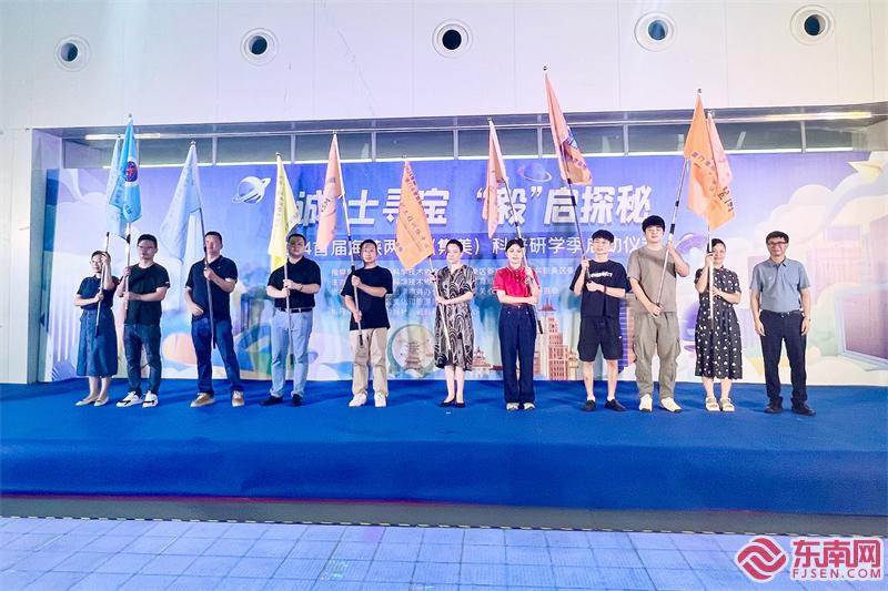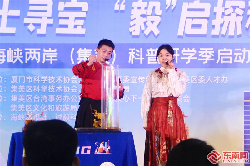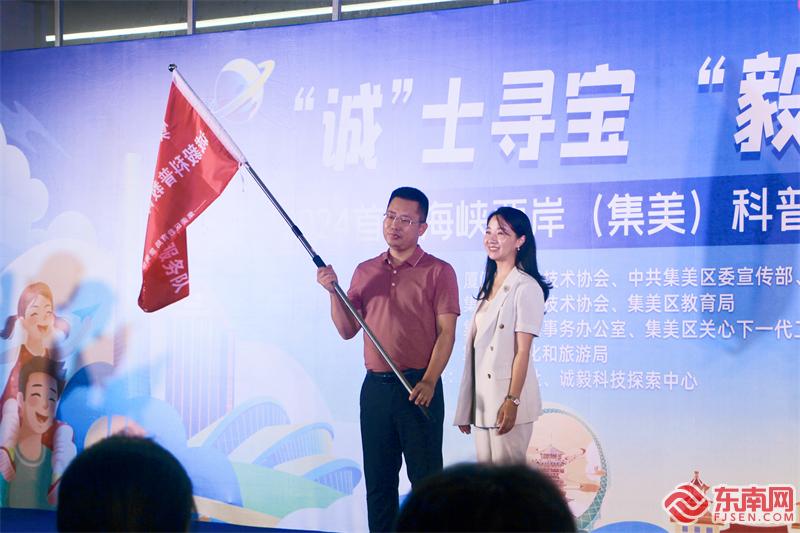 与会领导为20家科普教育基地代表授予活动主题旗(东南网记者 李霖 摄) 搭建平台 打造“两岸科普研学”新名片 启动仪式在原创科普情景剧《酷young实验室》中拉开序幕,通过剧情演绎、互动体验将科普知识、科学实验巧妙展现,为在场海峡两岸青少年带来了一场别开生面的科普小课堂。 此次科普研学季活动创设了科普基地研学营,招募两岸亲子家庭深入集美区20个科普教育基地探秘,开启自然科学、社会科学、技术科学与航天科学四大主题篇章,争当“诚毅科普探险家”。 启动仪式为厦门园林博览苑、厦门灵玲国际马戏城、诚毅科技探索中心等20家科普教育基地代表授予活动主题旗。各基地将发挥自身优势,为两岸青少年提供优质、丰富的科普教育资源。 值得一提的是,此次活动还向两岸亲子家庭征集“诚毅科普短视频”,鼓励两岸青少年围绕科普基地特色、嘉庚精神、科学探索精神等主题,创作并提交科普短视频,进一步宣传集美科普研学特色,助力打造“两岸科普研学”新名片。