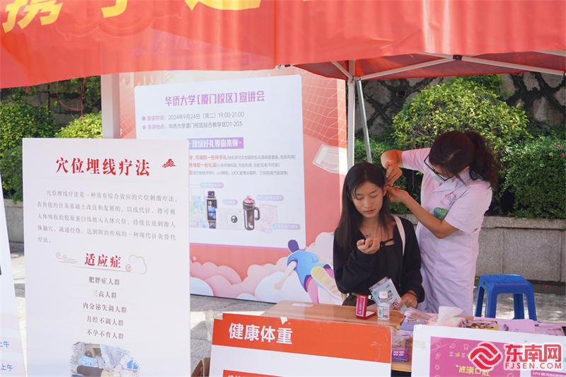 体验贴耳穴中医特色诊疗服务(霍雨露 摄) 校地携手送服务、送健康 “此次活动充分发挥了孩子们的专业知识和创新能力。”集美大学海洋食品与生物工程学院辅导员杨金月告诉记者,此次活动策划、组织均以学生志愿者为主力,希望通过生动有趣的宣传科普活动,倡导合理饮食,推动减糖行动。该院青年志愿者协会会长、大三学生王国铮说,能够将课本中学到的知识应用到活动中,是一次难得的实践。 华侨大学机电学院学生、医讯服务队志愿者小李说:“现在很多人的生活方式都不够健康,此次活动中加入了很多关于体质健康的相关内容。”华侨大学旅游学院大一新生小靳表示,通过医生、志愿者的讲解,她认识到了“三减三健”的重要性,也对自己的健康情况有了更深入的了解。 当天,侨英街道社区卫生服务中心、集美街道社区卫生服务中心医务人员分别前往华侨大学、集美大学活动现场,提供贴耳穴中医特色诊疗服务,科普中医埋线减肥法、健康运动处方及应急救护知识。 “通过刺激穴道可以达到抑制食欲、改善睡眠等目的。”侨英街道社区卫生服务中心公卫科科长裴姗妹表示,活动在倡导健康生活方式,提升大学生群体的科学体重管理意识的同时,也宣传了该中心的相关诊疗项目,推广了“校门口”的优质医疗服务。 据集美区疾病预防控制中心副主任蔡爱梅介绍,集美是著名的文教区,高校院所众多。以全民健康生活方式宣传月、“体重管理年”活动为契机,集美区充分挖掘辖区优势,搭建校地合作平台,举办两场高校宣传活动,旨在发挥高校大学生群体自主创新、自主管理等能力,达到教育一个学生、影响一个家庭、带动整个社会的辐射效果,同时深入推进以“三减三健”为主题,以体重管理为突破口的全民健康生活方式行动,倡导和推进文明健康生活方式,促进人们增强健康意识、提升健康素养,为构建健康校园、健康集美贡献力量。
