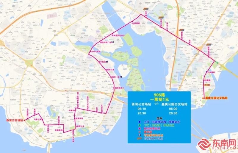 906路公交线路图(厦门运输中心供图) 东南网10月18日讯(记者 刘玮 通讯员 江安娜)为方便集美大社、嘉庚公园周边片区乘客接驳BRT嘉庚体育馆站及地铁集美学村站,结合嘉庚公园公交场站启用,10月21日起,906路和M27路将进行调整。 906路从集美北海湾改至嘉庚公园公交场站始发。线路走向为从西滨公交场站始发,行至浔江路集源路口,改经浔江路至嘉庚公园公交场站,往返一致,增停浔江路新设站点和嘉庚公园公交场站(浔江路新设首末站),减停集美北海湾。线路长度从18.35公里变为18.85公里,首末班时间为西滨公交场站首班6:10末班20:30,嘉庚公园公交场站首班6:00末班20:30。