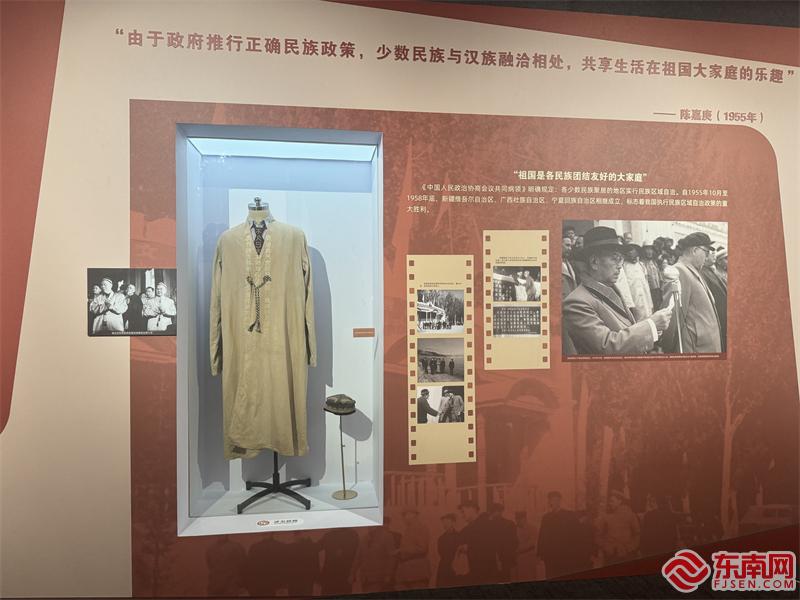 陈嘉庚在新疆维吾尔自治区成立大会上穿的维吾尔族服装(东南网记者 李奇 摄) 珍贵展品背后的故事 陈嘉庚在新疆维吾尔自治区成立大会上穿的维吾尔族服装 反映其高度重视民族团结 1955年9月30日,时任全国政协副主席的陈嘉庚先生,出席新疆省第一届人民代表大会第二次会议,大会赠送陈嘉庚先生维吾尔族服装。 在1955年10月1日,新疆维吾尔自治区成立庆典上,陈嘉庚先生说:“我相信新疆维吾尔自治区成立后,新疆各族的政治经济文化事业将更好地发展,新疆各族人民将以更高的热忱与全国人民一起共同为建设社会主义祖国而奋斗。” 陈嘉庚始终关注少数民族的解放和发展,新中国成立后,他曾先后访问过乌兰浩特、归绥(现呼和浩特)、包头等城市以及新疆、云南、贵州等少数民族较多的省份。通过参观,陈嘉庚欣喜地看到,少数民族与汉民族之间协作互助持续推动少数民族地区经济、社会发展。 这一珍贵文物不仅展现了陈嘉庚对民族平等和区域自治政策的坚定支持,也体现了他对民族团结的高度重视。不过,由于原件破损严重,此次展出的为复制品。