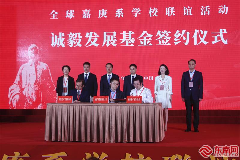 诚毅发展基金签约仪式(东南网记者 李霖 摄) 搭建高质量交流合作平台 广泛凝聚侨心侨力 今年是陈嘉庚先生诞辰150周年,同时也是习近平总书记给集美校友总会回信10周年。集美区委书记胡旭彬在讲话中表示,10年来,集美区大力传承弘扬嘉庚精神,勇立潮头、勇毅前行,发挥侨乡优势,推动高质量发展。集美区常住人口突破百万,全区GDP从近400亿元攀升至993.49亿元,城镇居民人均收入实现翻番。 “让我们以嘉庚精神为纽带,心向祖国,携手共进……”胡旭彬说,希望通过这次活动,搭建高质量交流合作平台,广泛凝聚侨心侨力,把更多的目光、更好的资源吸引到集美。集美将全力搭好桥梁、建好平台、做好服务,让更多的人共享新时代集美建设的发展机遇。 大会现场举行了东盟集美校友会揭牌仪式、诚毅发展基金签约仪式。 东盟是中国第一大贸易伙伴,众多嘉庚学子在东盟成员国居住、兴业。集美学校泰国校友会会长、泰国开放教育集团董事长赵明光表示,东盟集美校友会的成立,将促进东盟地区集美校友之间的交流与合作,加强校友与母校之间的联系,进一步促进中国与东盟国家间经济、文化往来。 据厦门市集美创业投资有限公司总经理王金伟介绍,诚毅发展基金总规模10亿元,首期规模2亿元,该基金带有鲜明的嘉庚烙印,基金的管理人、出资人均是由嘉庚系学校优秀校友担任高管的企业,基金投向也将围绕嘉庚系学校的校友创办的或者担任高管的企业,助力校友企业高质量发展。