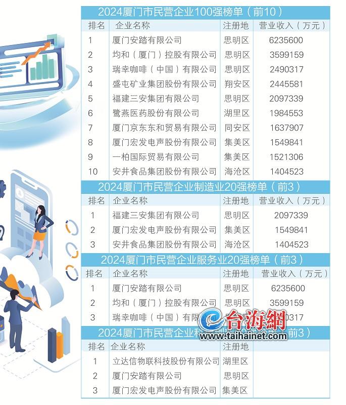 东南网11月2日讯(海峡导报记者 黄奕琳)今年,是厦门总商会成立120周年。11月1日,是第五个厦门企业家日。昨日上午,2024年厦门企业家日大会召开。省委常委、厦门市委书记崔永辉出席并讲话,代表市委、市人大常委会、市政府、市政协向广大民营企业家致以节日的祝贺和诚挚的问候,向大家为厦门发展所作出的贡献表示衷心的感谢。市委副书记、市长伍斌主持会议。 会上,柯希平、邹剑寒、郑立谋、陈方毅、缪国栋、许晓荣、洪伟、王梦君等8位企业家代表围绕“改革创新促发展勇担使命建新功”进行主题发言,弘扬企业家精神,建言高质量发展,进一步凝聚共识、提振信心,共促厦门民营经济发展壮大。 会上发布了2024厦门市民营企业100强系列榜单和2024年度全市“十佳”营商环境创新举措。 入围门槛稳步提高员工数量大增四成 今年是厦门市连续第四次发布厦门民企百强系列榜单和调研报告。报告显示,今年厦门民企百强榜的入围门槛为2023年度营业收入19.07亿元,较上年增长24.30%。与上年百强榜单相比,有77家企业再度入围,23家新入围,16家营业收入过百亿元。 厦门安踏有限公司蝉联榜首,营收623亿元。排名第二、第三的分别是均和(厦门)控股有限公司、瑞幸咖啡(中国)有限公司。瑞幸咖啡表现优异,位列第三,营收达249.03亿元,增加166.9亿元,是营收增量最大的企业,排名也提升了13位。首次参评的厦门京东和新能安营业收入引人瞩目,厦门京东以163.79亿元排名第7位;新能安以75.61亿元列第20位。 统计显示,2024厦门民企百强研发经费投入总额达113.86亿元,同比增长17.82%;民企百强纳税总额216.26亿元,同比减少37.65亿元,降幅14.83%;民企百强有效促进就业,员工总数达36.48万人,较上年大幅增长40.25%。 厦门民企百强税后净利润总额373.24亿元,同比增加54.42亿元,增幅17.07%,但盈利呈现两极分化,厦门安踏税后净利润112.77亿元,增幅达59.06%,瑞幸咖啡和三安集团净利润增长显著。与此同时,民企百强中有12家企业出现亏损,较上年增加2家,亏损总额为9.93亿元,其中7家是批发业。综合来看,民企百强的销售利润率和资产利润率分别为5.64%和5.83%,净资产收益率为8.15%,减少3.34个百分点,是近年来新低。 |