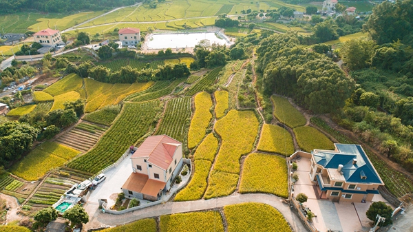 风吹稻浪、秋意十足,民居被金灿灿的稻海包围,呈现出一幅幅和谐优美的田园画卷。
