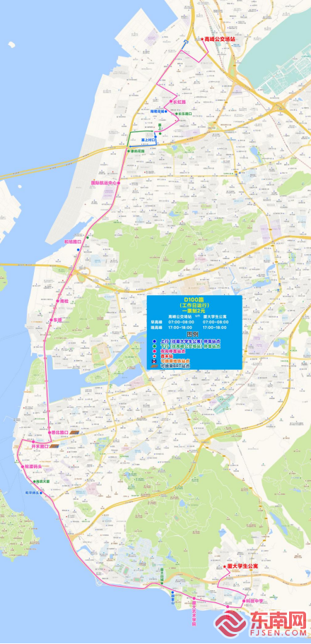 D100路通勤快线公交线路图(厦门运输中心供图) 东南网11月5日讯(本网记者 刘玮 通讯员 李凌云)记者今日从厦门公交集团有限公司了解到,为提升市民通勤效率,缓解早晚高峰时段的交通压力,特别推出了D100路通勤快线,该线路连接高崎公交场站与厦大学生公寓,采用“定时定点+减站提速”的运行模式,旨在为市民提供更快捷、更舒适的跨区出行选择。 D100路通勤快线在早晚高峰期间运行,通过减少停靠站点,提高线路运行效率。该线路保留了寨上片区、湖里老城区、思北路口、厦大学生公寓等客流集中区域,同时调整路线避开拥堵路段,预计可节约15-20分钟的运行时间。此外,D100路还增停了开禾路口、轮渡码头、海滨大厦(往高崎方向)、和平码头(往学生公寓方向)等大客流站点,以满足沿线乘客的出行需求。 D100路是基于22路公交线路的优化升级,相较于22路的37个站点,D100路仅设有18个站点,显著减少了停靠次数。22路公交线路每日运行,而D100路则仅在工作日运行,高崎公交场站和厦大学生公寓的首末班车时间分别为7:00-8:00和17:00-18:00。 在早高峰时段,22路往厦大方向的运行时间约为95分钟,而D100路可减少25分钟;晚高峰时段,22路往厦大方向的运行时间约为91分钟,D100路可减少17分钟。这一改变将大大提升沿线乘客往返湖里区自贸区象屿片区、思北开禾路口周边写字楼及软件园一期的通勤效率。 D100路的票价为一票制5元,但在试运行期间,票价为2元。市民可以通过厦门公交APP查看线路详情,以更好地规划自己的通勤路线。 厦门公交集团有限公司致力于打造国内领先的城市公共交通出行服务商,通过不断探索和创新,为市民提供更加便捷、高效的出行选择。D100路通勤快线的推出,是构建“公交+”多元化公共交通体系方面迈出的重要一步。 |
