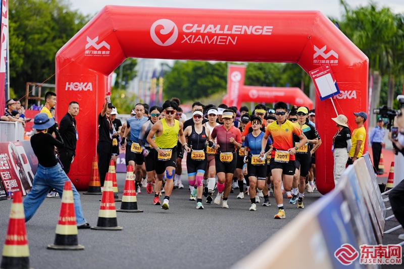 领导嘉宾为赛事鸣笛开赛(东南网记者 刘玮 摄) 东南网11月9日讯(本网记者 刘玮)11月9日,2024 Challenge Xiamen厦门铁人三项公开赛在厦门环东浪漫线美峰体育公园进行第一个比赛日的比赛。有上千名选手参加了全程(51.5km)组和半程(25.75km)组,骑跑两项组以及小铁人组和小小铁人组的比赛。在10日的第二个比赛日中,还将有400多名铁人将挑战全长113km的中距离项目,这其中还包括为年度积分而战的17名职业选手。 同安区人民政府副区长何岚岚、同安区文化和旅游局局长陈丽霜、厦门体育产业集团总经理王玉良、厦门体育产业集团总经理助理、赛事公司总经理、执行董事曹斌等领导出席了9日的开幕式并鸣笛开赛。 全程组的选手们先在同安湾海域展开1.5公里游泳赛段的争夺,自行车赛段与跑步赛段均在平整的环东彩虹跑道上进行,全程组的选手需要完成4圈共计40公里的骑行和2圈共计10公里的奔跑。不同组别的区别仅为各赛段长度不同。骑跑两项组的选手不进行游泳赛段,而是进行跑步——自行车——跑步的比赛。