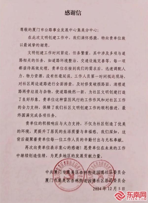 集美公路部门获社区的感谢信(厦门公路中心供图) 东南网12月11日讯(本网记者 刘玮 通讯员 葛艳红)12月10日,厦门市公路事业发展中心下属的集美公路部门收到了来自杏林街道园博社区的一封感谢信,信中对集美公路部门全面排查并及时修复破损路面和附属设施的工作表示了高度赞扬,认为这些努力使道路焕然一新,为社区文明创建打造了良好形象。 今年以来,集美公路部门积极响应全市创建全国文明城市的工作要求,根据市、区主管部门的工作部署,结合管养道路的实际情况,对照新版测评体系标准,坚持问题导向,持续在巩固成果、健全机制、保持常态上下功夫,切实补齐各方面短板弱项,实现道路专业化精细化养护,保障道路“畅、安、舒、美”,为文明城市创建贡献交通公路力量。 为加强组织领导,集美公路部门建立了路长责任制,将辖区每条道路落实到具体责任人,每月不定期组织徒步检查,确保及时发现并整改各类问题,同时,加强与属地镇街、社区沟通协调,形成“条块结合、齐抓共管、形成合力”的工作格局,全力保障辖区文明城市创建工作。