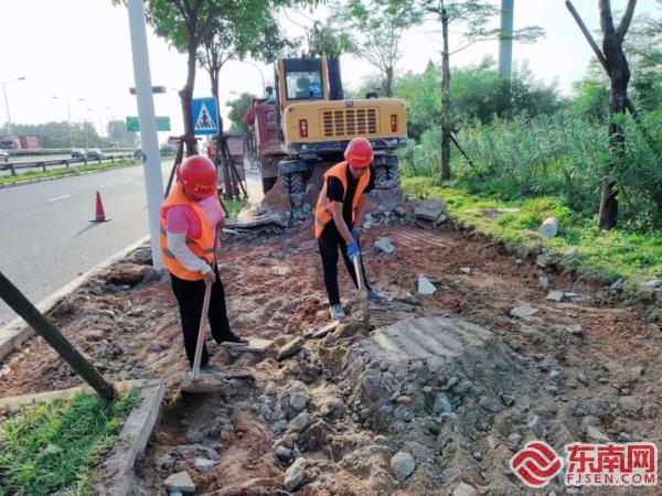 施工人员将原彩砖人行道挖开(厦门市公路中心供图)