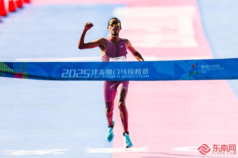 达维特·沃尔德·阿雷加获得男子组冠军(主办方供图) 男女冠军双双破赛会纪录 作为2025开年全球首场“世界田联白金标赛事”,本届赛事汇聚了全球顶尖的高水平运动员。其中,男子成绩进入2小时19分20秒以内的共47人,女子成绩进入2小时39分20秒以内的有40人。 经过两个多小时的激烈角逐,来自埃塞俄比亚的Dawit Wolde AREGA(达维特·沃尔德·阿雷加)以2小时06分06秒的成绩获得男子组冠军,打破尘封10年的厦门马拉松赛男子赛会纪录,并将原纪录提升了13秒。他表示:“这是第一次来到中国大陆参加马拉松,厦门是一座非常美丽的城市,有机会一定再来参赛,也希望更多的人到赛道上感受厦门马拉松的魅力。” 来自莱索托的Tebello RAMAKONGOANA(特贝罗·拉马孔戈纳)以2小时06分18秒的成绩获得男子组亚军,同样打破了厦门马拉松赛会纪录,并刷新莱索托国家纪录。上届厦马冠军,来自埃塞俄比亚的选手Boki Kebebe ASEFA(博基·科贝贝· 阿塞法)以2小时06分32秒的成绩获得男子组季军。