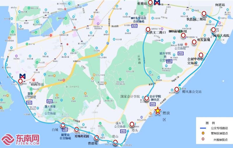 公交接驳线路示意图(厦门交警供图) 公交接驳方案 为方便市民和游客前往观看焰火晚会,厦门交警安排了公交接驳服务。交通管制后,公交车辆将在环岛路太阳湾调头区(西向)、环岛路椰风寨公交站(东向)、国家会计学院(北向)调头,接驳服务持续至18:30。具体线路如下: 临1路(地铁岭兜—椰风寨):去程经金山路、吕岭路、展鸿路、前埔北路、环岛东路、环岛南路至椰风寨;返程经环岛南路、环岛东路、会展北路、展鸿路、前埔北路、环岛干道、吕岭路、金山路至地铁岭兜站。 临2路(第一码头—溪头下):去程经西堤路、厦禾路、鹭江道、演武大桥、环岛南路至溪头下;返程经环岛南路、演武大桥、鹭江道、西堤南三路、西堤路至第一码头。 临3路(洪文二路口—国家会计学院):去程经云顶中路、云顶隧道、云顶南路至国家会计学院,往返一致。