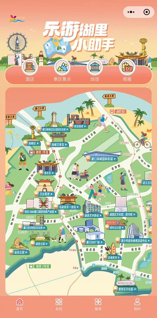 2024年成功上线“乐游湖里小助手”小程序,上线湖里区电子旅游地图,围绕“吃、住、行、游、购、娱”六大板块,将湖里区全域文旅资源分类全景呈现,进一步提升旅游体验。
