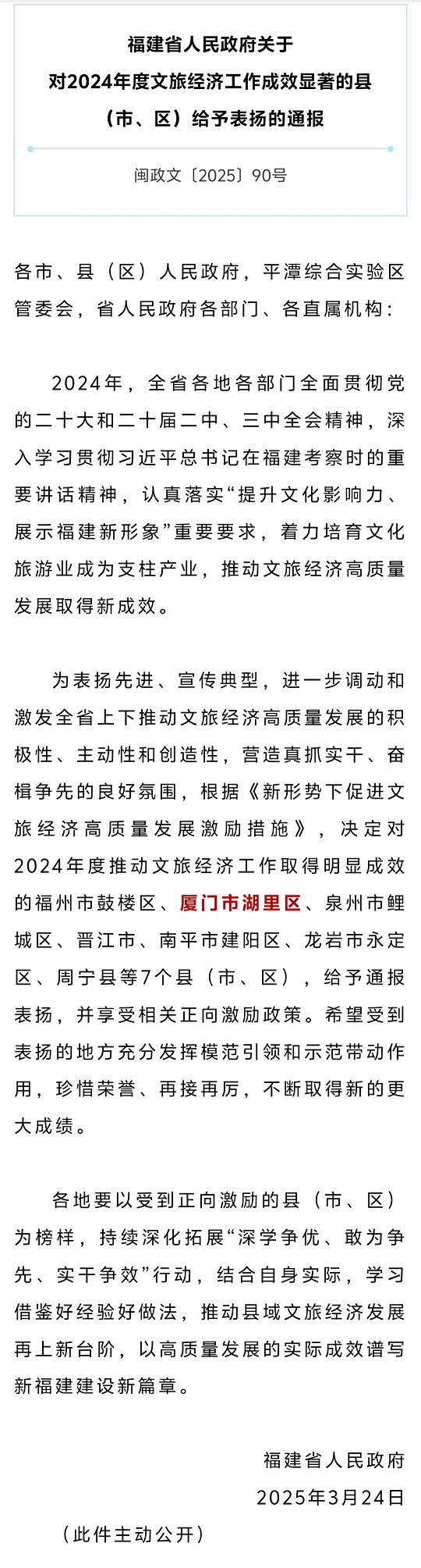 近日 福建省人民政府关于 对2024年度文旅经济工作 成效显著的县(市、区)给予通报表扬 厦门市湖里区入选!