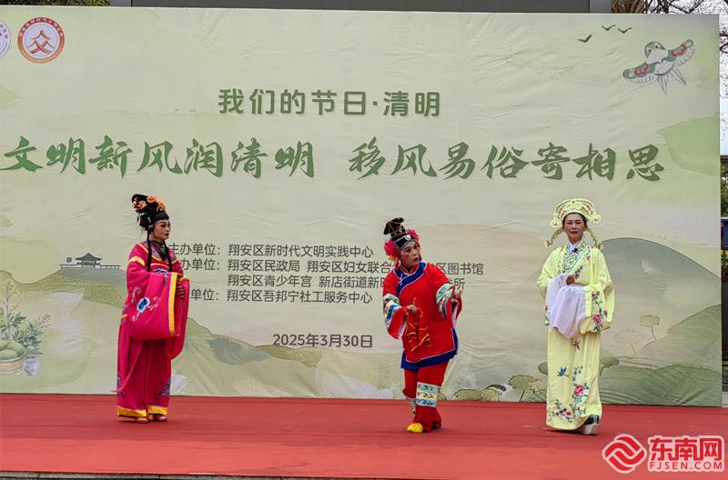 芗剧说唱《倡导厚养薄葬 共树社会文明新风》(东南网记者 夏菁 摄) 东南网3月30日讯(本网记者 夏菁 通讯员 童心悦)清明节是中华民族缅怀先人、寄托哀思的传统节日,也是传承家风、弘扬孝道的重要载体。30日上午,“文明新风润清明 移风易俗寄相思”主题活动在厦门市翔安区法治文化广场举行,引导广大群众在慎终追远、缅怀先辈的情怀中认知传统、尊重传统、继承传统、弘扬传统,倡导移风易俗,树立文明新风,营造文明和谐的社会氛围。 活动现场,舞台区的表演将移风易俗理念巧妙融入艺术形式。青少年宫的孩子们朗诵《光的赞歌》,以诗歌的力量传递文明缅怀、绿色清明的美好愿景。答嘴鼓表演者以幽默诙谐的语言宣传文明祭扫、绿色殡葬等移风易俗理念。芗剧说唱《倡导厚养薄葬 共树社会文明新风》更是巧妙地将传统戏韵与现代文明深度融合,生动演绎了厚养薄葬的深刻内涵,引发了现场观众的强烈情感共鸣。 |