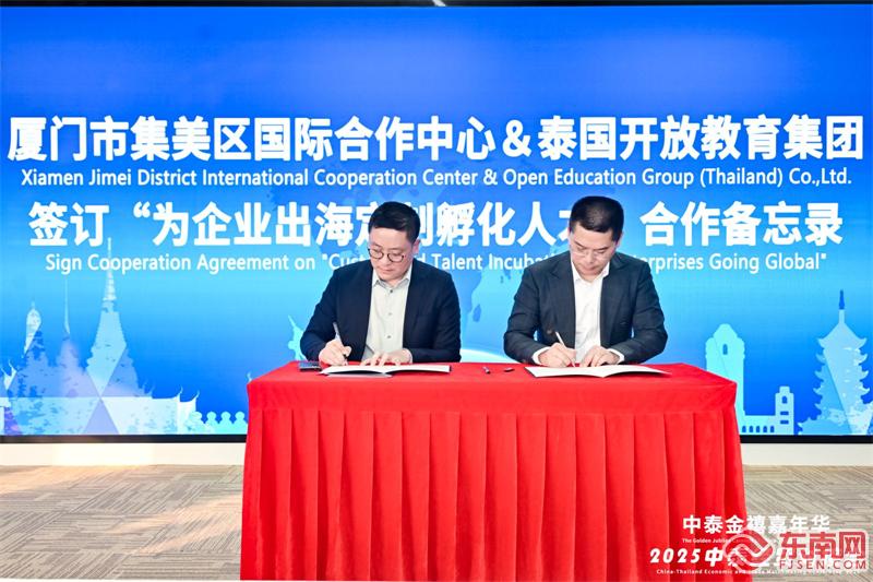 2025中泰经贸对接会现场(主办方供图) 东南网4月8日讯(通讯员 郭妮妮 林岚)日前,2025中泰经贸对接会在厦门集美举行。厦门市、集美区相关部门负责人及企业代表者共100余人参加。 会上,中泰政府机构相关负责人及行业专家围绕泰国投资促进委员会(BOI)的基本优惠政策与投资激励措施、泰国优质工业园区推介、海外投资风险提示、出海企业人才发展途径以及企业境外税收政策合规化等多个方面,深入讲解相关政策,分析投资机遇,为厦企在泰国投资发展提供有价值的参考。 在厦门市投资贸易(泰国)服务点的积极推动下,集美区金融事务中心(集美区国际合作中心)与泰国开放教育集团就助力厦企出海孵化专项人才签订战略备忘录,以进一步优化人才培养与输送机制,为厦企在泰长远发展提供坚实的人才保障。 今年是中泰建交50周年暨“中泰友谊金色50年”,近日,“中泰金禧嘉年华”系列活动在集美举办,从3月27日持续至4月7日。活动以“文化搭台、经贸唱戏”,涵盖中泰文艺展演、中泰经贸对接会、泰国小商品及中国非遗产品市集等,编织民心相亲新纽带,架起共赢发展新桥梁,借活动契机,积极打造独具“嘉庚”特色的国际化支点城区。 此次活动由集美区人民政府外事办公室、区商务局主办,厦门市天下集美文广传媒有限公司、厦门市集美区东盟文化经济交流中心、厦门市投资贸易(泰国)服务点承办。