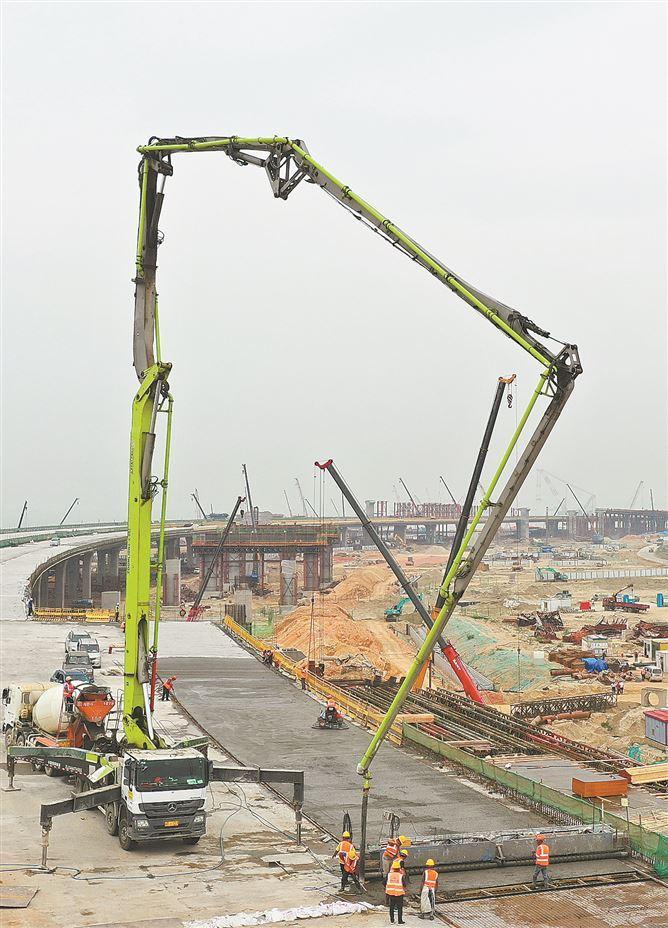 五一期间,厦门翔安国际机场核心区仍有近15000名建设者坚守岗位。图为机场快速路B2标,工人们忙着进行水泥浇筑。