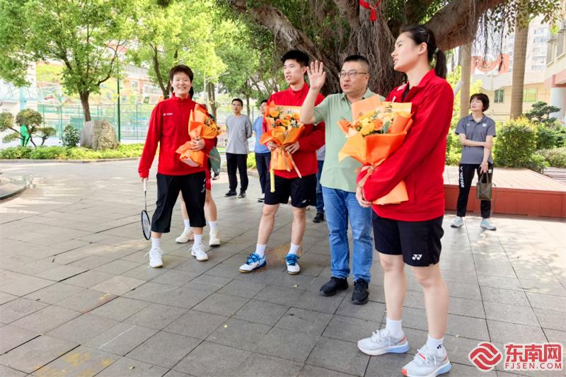 四位羽毛球冠军走进厦门市槟榔小学(东南网记者 刘玮 摄) 东南网5月6日讯(本网记者 刘玮 李奇)5月6日下午,厦门市槟榔小学迎来了一场别开生面的羽毛球盛宴——“冠军领航 羽梦同行”羽毛球冠军进校园活动。本次活动邀请到翁泓阳、韩悦、刘圣书、谭宁四位羽毛球冠军,旨在借助冠军的榜样力量,推动羽毛球运动在青少年群体中的普及与发展,激励青少年培养拼搏精神与竞技梦想,树立健康向上的生活态度。 当日下午,冠军选手在槟榔小学校门口受到了学生代表的热情迎接,他们为冠军选手戴上红领巾,并为其介绍学校体育事业的发展情况。在学校多功能厅,全体学生起立鼓掌欢迎冠军选手的到来。随后的冠军分享会环节,冠军们依次登场,分享了自己与羽毛球的故事,阐述了羽毛球运动在他们生命中的重要意义。