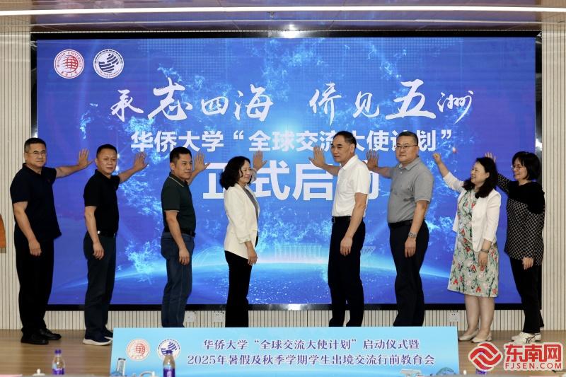与会嘉宾共同启动“全球交流大使计划”(郑艺晗 摄) 东南网5月31日讯(通讯员 孙丛强 马博文)5月30日下午,华侨大学“全球交流大使计划”启动仪式在王源兴国际会议中心举行。经选拔,该校10名学子成为华侨大学首届“全球交流大使”。 “全球交流大使计划”是华侨大学深入推进教育国际化的创新实践,也是落实教育部“平安留学”工作的具体行动。该计划旨在选拔一批曾出境交流的优秀学生,担任“跨文化传播使者”“平安留学宣讲员”“全球交流推广员”等多重角色,通过创意内容分享、经验交流传递等方式,助力更多华大学子在全球舞台上行稳致远,展现中国侨校青年风采。 作为一所国际化特色鲜明的高校,2025年暑假及秋季学期,华侨大学将有25个学院的184名学生赴澳大利亚、比利时、波兰、法国、美国等13个国家和中国港澳地区高校交流。当天,华侨大学副校长王秀勇为“新加坡南洋理工大学研究生奖学金团”“优秀学生访港访澳团”“马来西亚拉曼大学学分交流项目”代表授旗。 出境交流行前教育会同期举行。来自教育部、厦门市国家安全局、华大新闻与传播学院等专家、学者为学生们开展行前培训。首届“全球交流大使”代表结合自身经历,向即将出境的同学发起交流倡议和经验分享。 王秀勇致辞表示,希望即将出境的学子在“走出去”的过程中,珍惜交流学习机会,汲取先进知识;主动融入当地社会,传播中华文化;严守法律法规,尊重文化差异,树立中国青年良好形象。同时,期待“全球交流大使”积极成为学校出境交流与校内宣传的桥梁,为学校国际化建设贡献智慧和力量。 活动前,师生共同观看记叙片《承志四海·侨见五洲》,回顾华大学子近年来参与出境交流项目的点滴时刻,感受多元文化交流的深刻意义。 |