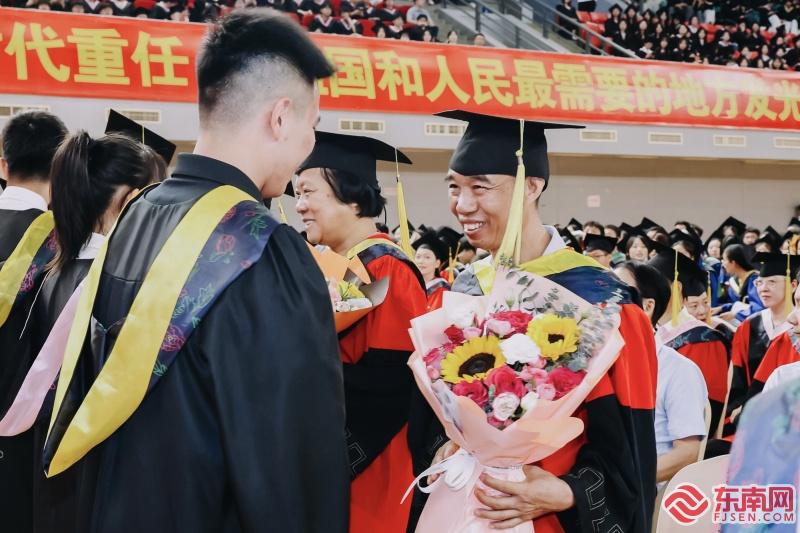毕业生代表向教师代表、校友代表、学校后勤服务人员代表献花致谢(主办方供图)