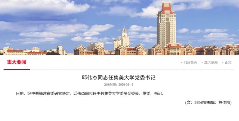 东南网6月13日讯(记者 李霖 通讯员 陈振星)日前,经中共福建省委研究决定,邱伟杰同志任中共集美大学委员会委员、常委、书记。