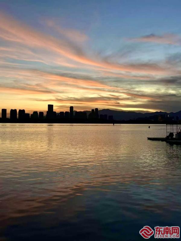 晚霞的光芒将水面染成金色(东南网记者 李霖 摄)
