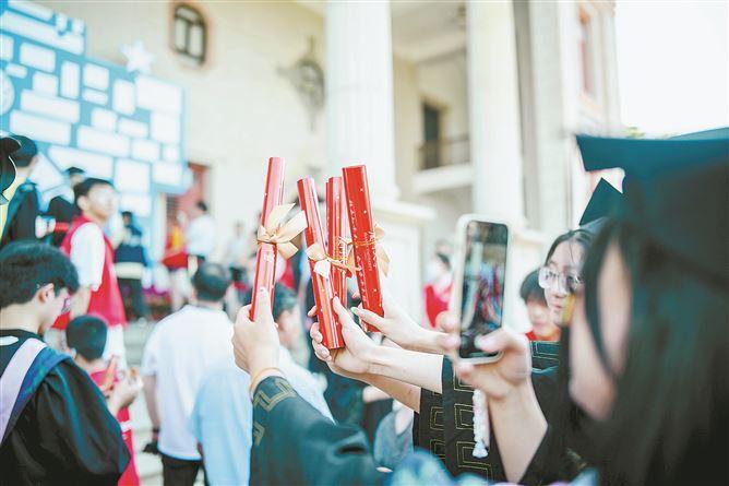 参加完毕业典礼的学生们在场外继续拍照打卡。(本报记者 林铭鸿 摄)