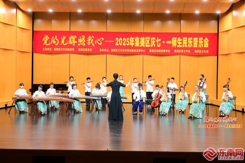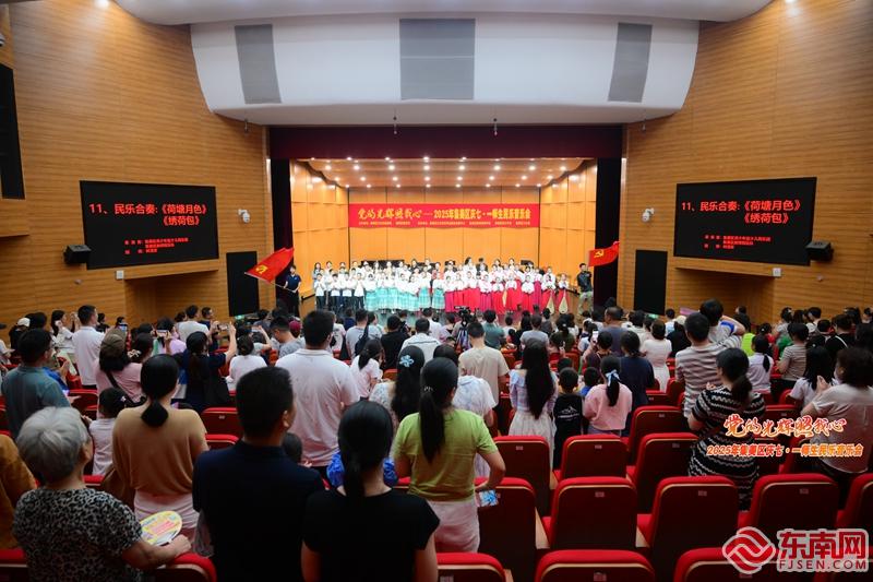 全场共同高唱《没有共产党就没有新中国》(集美区青少年宫供图) 东南网7月2日讯(本网记者 刘学佳 通讯员 邱程亮)7月1日晚,厦门市集美区青少年宫滨水总部剧场内乐音流淌、掌声雷动。为庆祝中国共产党成立104周年,一场“党的光辉照我心”庆“七一”师生民乐音乐会在此精彩上演。来自集美区的师生们以民乐为媒,用旋律回溯党的百年征程,为现场观众献上了一场精彩的视听盛宴。 “月中天渔舟唱晚,梦里水乡意绵绵……”音乐会在杏东小学“三爱”民乐团一曲优美婉转的民乐合奏《水乡情韵》中拉开帷幕,悠扬的旋律和学生们富有情感的演奏,让观众们沉浸在音乐的海洋中。随后,来自集美区各学校的师生们纷纷登台献艺,带来了一系列精彩纷呈的节目。二胡齐奏《战马奔腾》以激越弓法再现沙场豪情,古筝齐奏《战台风》用铿锵节奏演绎抗争精神,清脆悦耳的竹笛演奏《万疆》勾勒出华夏山河的壮丽画卷。 值得一提的是,本场音乐会特别呈现两首师生民乐合奏佳作,由集美区青少年宫少儿民乐团与教师民乐队联袂演绎《荷塘月色》《绣荷包》,师生们用精湛的技艺和真挚的情感,将歌曲中蕴含的传统文化演绎得淋漓尽致,引得现场掌声不断。 演出最后,全场共同高唱《没有共产党就没有新中国》,将整场音乐会推向高潮。现场观众表示,这场音乐会不仅让他们欣赏到了高水平的民乐表演,更让他们在音乐中接受了一次深刻的爱国主义教育。 主办方相关负责人表示,举办此次音乐会旨在通过音乐这一独特的艺术形式,激发师生们的爱党爱国热情,传承红色基因,弘扬民族精神。同时,也为集美区的师生们提供了一个展示才华的平台,促进了校园文化的繁荣发展。 本场音乐会由集美区文化和旅游局、集美区教育局主办,集美区文化体育事业服务发展中心、集美区教师进修学校、集美区青少年宫、集美区文化馆承办。