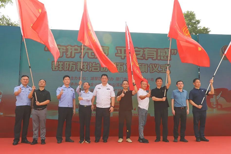 ▲相关领导为五支队伍授旗,分别为:湖里街道“山海守护队”、殿前街道“殿警联防”、禾山街道“禾美义警”、江头街道“江枫义警”、金山街道“金朋好友”。 接过鲜艳的队旗,迈上新的起点 进一步强化责任感、使命感 主动作为,团结协作 做好维护秩序的帮手、应急维稳的后援 和政策宣传小喇叭,进一步成长为一支 “拉得出、用得上、打得赢”平安尖兵