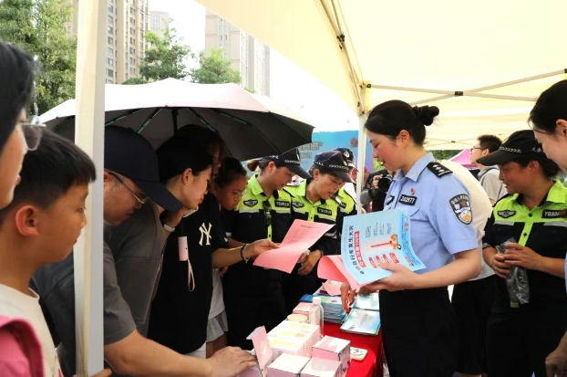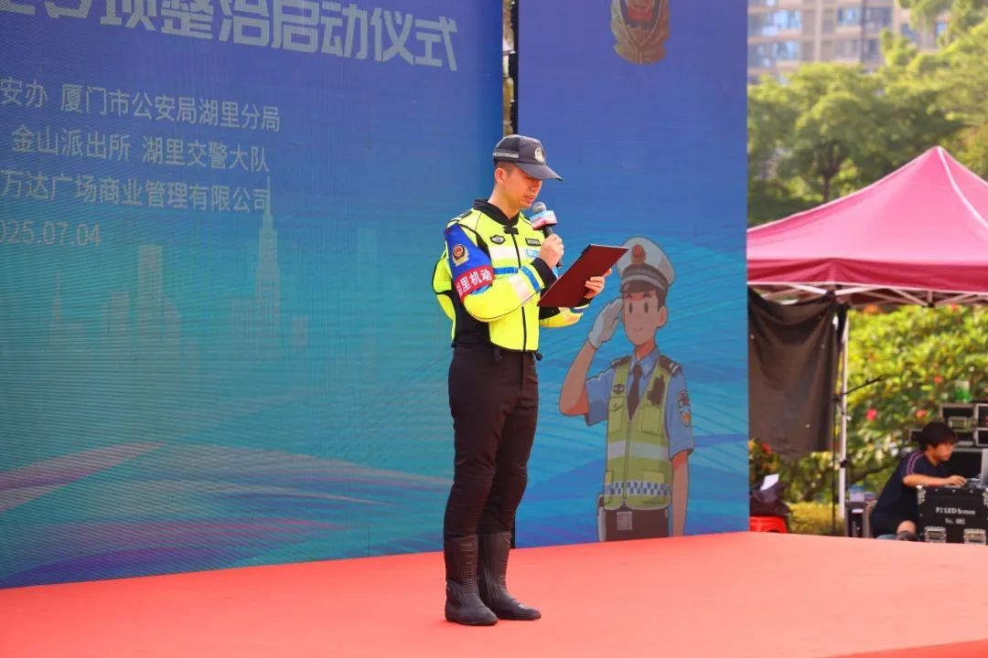 “金朋好友”的发起人刘志义在发言分享中,回顾了从建队时12人到如今318人的发展经历。 “金朋好友”这支成立于2022年警察节后一天的平安巡防队,365天坚持不懈、风雨无阻,积极配合街道和派出所开展平安巡逻、矛盾调解、安全宣传、文明督导、民政救助等平安共建工作,被辖区居民称为“万金油”式的亲朋好友,成为平安湖里群防群治力量中的标杆。 02 “交通绿” 平安出行亮绿灯 现场相关领导 上台按灯启动了湖里区 夏季道路交通安全专项整治 吹响了干字当头、积极作为的行动号角 平安出行,要从你我做起 平安湖里,更需群策群力 活动现场,交警代表 向全区市民朋友发出了倡议