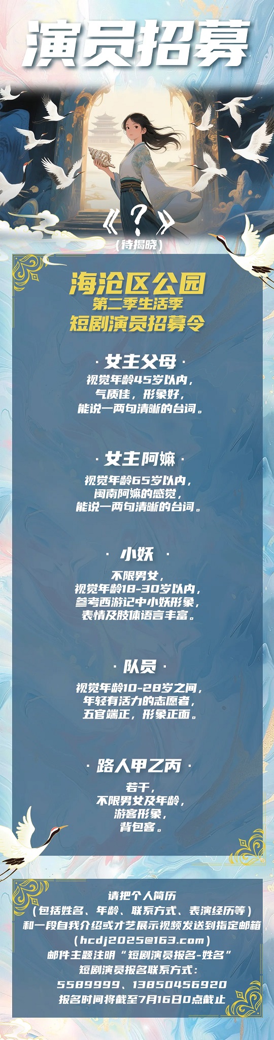链接2:报名方式 在海沧那些美到冒泡的公园里,化身酷炫角色,和超有趣的伙伴们一起飙戏,是什么样的感受呢? 不管你是戏精本精,还是隐藏的表演天才,亦或是挑战自我的小伙伴,都别犹豫啦!赶紧来报名,说不定下一个短剧大明星就是你!