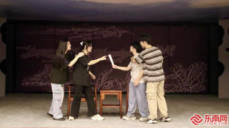 实践队队员试演《芗水歌》剧照(刘阳熠 供图) 话剧为媒 加深当代闽台情感联结 从文化体验到活态传承,实践队走进东山县铜陵人民戏院,参观院内的非遗展区,在丰富的文化遗存中汲取灵感,“就地取材”选取具有漳台特色的文化元素,并结合前期实践调研成果,精心打磨了原创闽台话剧《芗水歌》。该剧立足闽台同源的歌仔戏,巧妙融入锦歌、鸽子戏等地方艺术符号,讲述了年轻一代在传播两岸非遗文化过程中遭遇的挫折与挑战,生动展现了当代青年为两岸文化融合贡献的青春力量。实践队还在现场进行了话剧试演,取得戏院工作人员和在场观众的一致好评。 据悉,集美大学“影焕闽台”实践队始终秉持“两岸话剧、一脉相承”理念,以青年视角为切入点,探索两岸文化发展创新路径。在为期三天的实践活动中,团队深入多地参访调研,深挖历史文化底蕴,精选典型案例,扎实开展剧本创作。 下一步,该团队将持续推动闽台话剧展演走进社区、企业、学校,以话剧为媒讲好闽台故事,不断深化两岸同胞情感联结,为促进闽台文化融合注入青春动能。 |