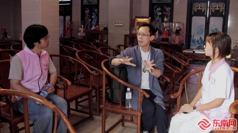 实践队成员采访陈瑞松(中)(张家婧 供图) 东南网7月16日讯(通讯员 陈希 戴雨欢 吴婧怡)近日,集美大学“影焕闽台”实践队赴福建省漳州市各文化场所开展暑期“三下乡”社会调研,通过实地走访、剧本创作及快闪展演等方式,以青年视角探索两岸融合发展新模式。 木偶牵线 激活两岸文化共鸣基因 作为两岸木偶艺术同根同源的实物见证,漳州古城木偶艺术展示馆内珍藏的展品生动展现了闽台两地一脉相承的艺术审美与文化基因,为实践队提供了直观的调研样本。在参观过程中,实践队与在馆排演的闽南师范大学文学院副教授、话剧社负责人陈瑞松进行深入交流。 陈瑞松来自台湾,长期深耕戏剧创作领域。作为一名在闽台胞,他怀揣“以剧为桥,唤起两岸情感共振”的初衷,深入发掘闽南“民间信仰”“两岸家书”背后的闽台基因共鸣。同时,陈瑞松与木偶展示馆开展合作,在话剧表演中融入投影、人偶共现等新形式,让两岸共同文化记忆演得出新意,传得出乡情,留得住来客。