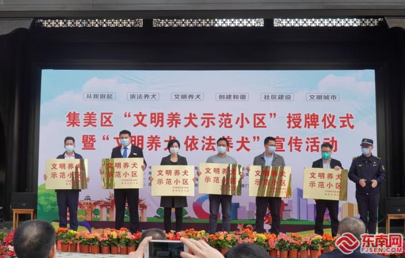 文明养犬示范小区授牌(集美区城管执法局供图) 暖心服务赢得民心 便民惠民落到实处 “一只犬的背后,是一个主人、一个家庭。执法的目的不是处罚,而是规范。”集美区城管执法局副局长江峰告诉记者,规范养犬工作不仅关乎社会公共秩序和城市文明形象,也是对养犬人的正当权利的保护,更是对一座城市治理精度与人文温度的双重考验。 坚持从“末端执法”向“靠前服务”,集美区广泛宣传养犬管理办法,将管理融入服务,切实提升养犬便利度与认同感。2022年12月,集美创新打造岛外首个文明养犬示范小区,“示范一个、带动一片、辐射全域”的良性循环就此展开。 随后,另外五个“2.0版”示范小区评选而出。至此,“两无、三好、四百、五有”(即无流浪犬、无违规犬,管理好、环境好、氛围好,知晓率100%、登记率100%、免疫率100%、牵绳率100%,有制度、有队伍、有设施、有活动、有激励)的示范小区标准确定下来。 从标准到落地,真正让文明养犬实现便民惠民。截至目前,集美区新增宠物便箱、遛犬专区等设施45处,群众满意度达96%。 2023年开始,集美区在全市首创“文明养犬进社区”服务,邀请宠物医院在居民“家门口”开展狂犬病疫苗注射及免费宠物狗查体,并通过“线上预约+上门服务”,实现免疫-登记-芯片植入“1小时办结”。截至目前,集美全区累计办理养犬登记证近3000个,居岛外四区之首。