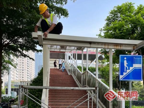 公路部门对人行过街天桥顶棚进行修复(厦门市公路中心供图)