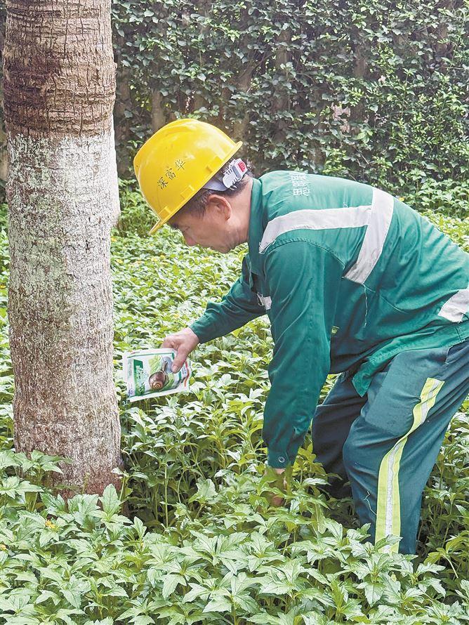 金榜公园内,绿化工人往蜗牛多的树下撒药。(记者 吴燕如 摄)