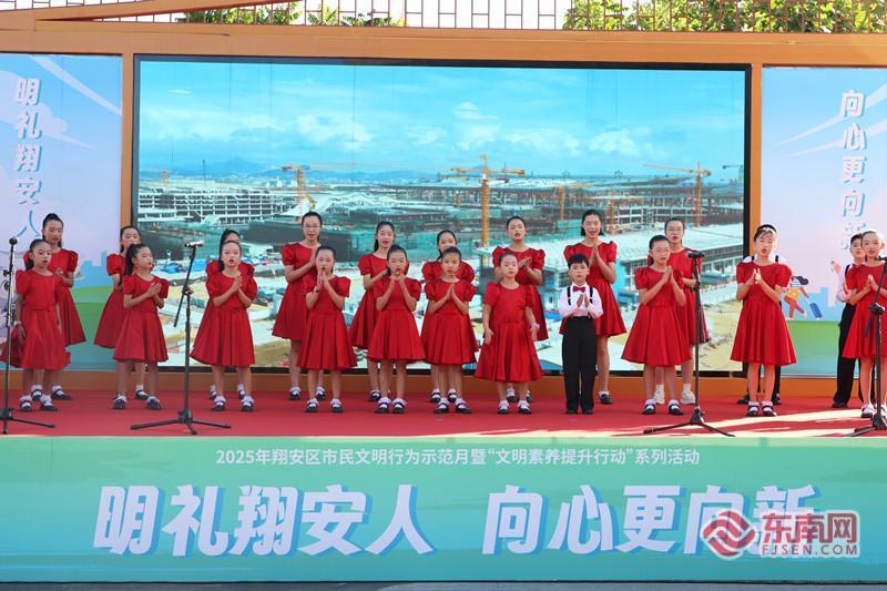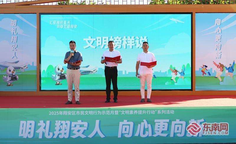 3名文明榜样代表的铿锵宣言引发全场热烈共鸣(东南网记者 刘学佳 摄) 东南网8月9日讯(本网记者 夏菁 刘学佳 通讯员 蔡惠婷)8月9日,“汇聚榜样星光 共铸文明翔安”2025年翔安区市民文明行为示范月暨“文明素养提升行动”系列活动在厦门市翔安区闽篮新天地举行。此次活动由中共厦门市翔安区委文明办、翔安区新时代文明实践中心主办,各镇(街)新时代文明实践所协办,旨在持续深化文明创建成果,以榜样为引领,大力弘扬时代新风尚。 榜样引领树新风 微光汇聚暖人心 自6月28日翔安区市民文明行为示范月启动以来,全区上下积极响应,文明的热潮在辖区内处处涌动,汇聚成一股强劲的奋进力量。 活动现场,播放的翔安文明成果回顾视频,以一幕幕生动的文明场景,展现了翔安区文明创建的丰硕成果。“百名榜样耀翔安”——文明榜样人物事迹展播环节,让群众近距离走近可敬可学的身边榜样,感受他们带来的温暖与力量。 在“文明榜样说”环节,3名文明榜样代表的铿锵宣言引发全场热烈共鸣,朴实的话语中蕴含的文明力量直抵人心。2014年“福建好人”、眼镜行业从业者蔡金桔以行业初心发出倡议:“以‘明镜’之心,诚待八方客;用点滴善举,共筑成才梦。”2019年“福建好人”、市政工程管理员陈亮立足岗位许下承诺:“甘当城市‘螺丝钉’,爱岗敬业守初心;路遇难处伸援手,共筑幸福文明城。”2024年“中国好人”、退役军人邓彦带着军人本色高声倡议:“褪去戎装不褪色,永葆军人真本色;危难时刻显担当,共创文明新风尚!” 翔安区委文明办相关负责人表示,后续翔安区将开辟“文明翔安”先进典型宣传专栏,持续讲述榜样故事,并融入“促兴翔谈”等主题活动,让榜样光芒照亮更多人心灵,推动社会文明新风尚蔚然成风。